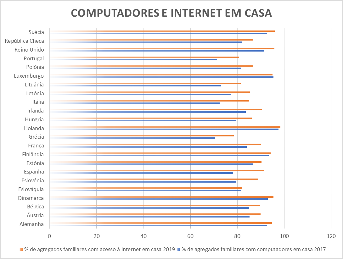 Segundo a Organização para a Cooperação e Desenvolvimento Económico (OCDE), 71,4% das famílias portuguesas admitia em 2017 ter em casa pelo menos um computador a funcionar; no espectro europeu só as famílias gregas estavam piores do que nós: 70,5% tinham um computador em casa. Tinham acesso à internet em casa, por ligação telefónica, ADSL ou cabo, 80,9% das famílias portuguesas, em 2019. Apenas na Grécia, as famílias estavam ainda menos “ligadas” do que em Portugal.